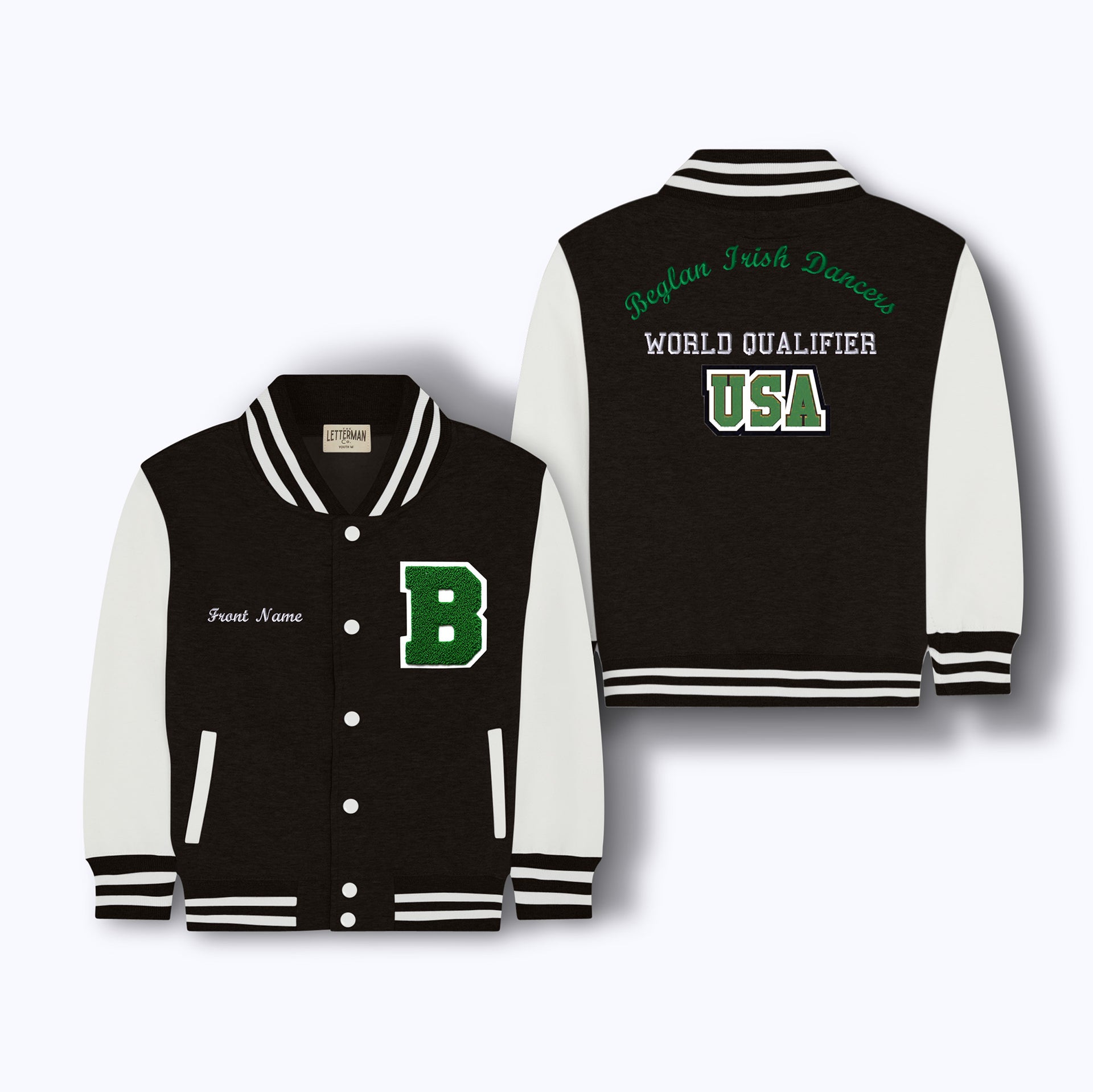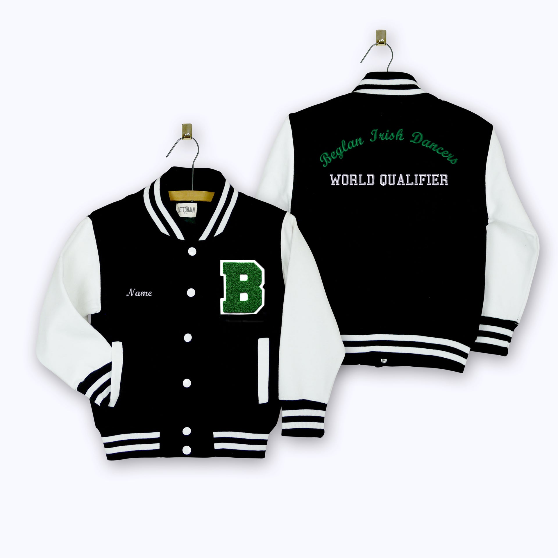 - Back upper = Embroidered 'Beglan Irish Dancers' (Script font, Kelly Green, Curved)