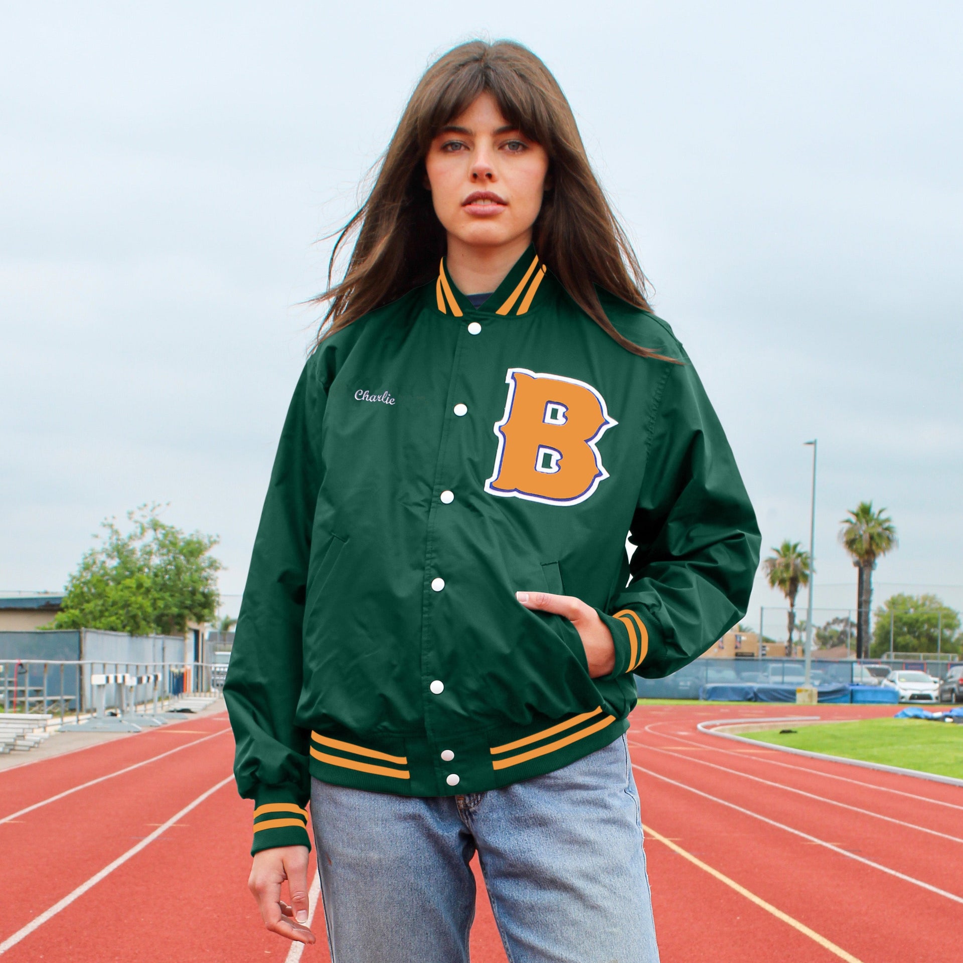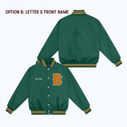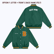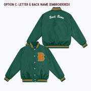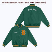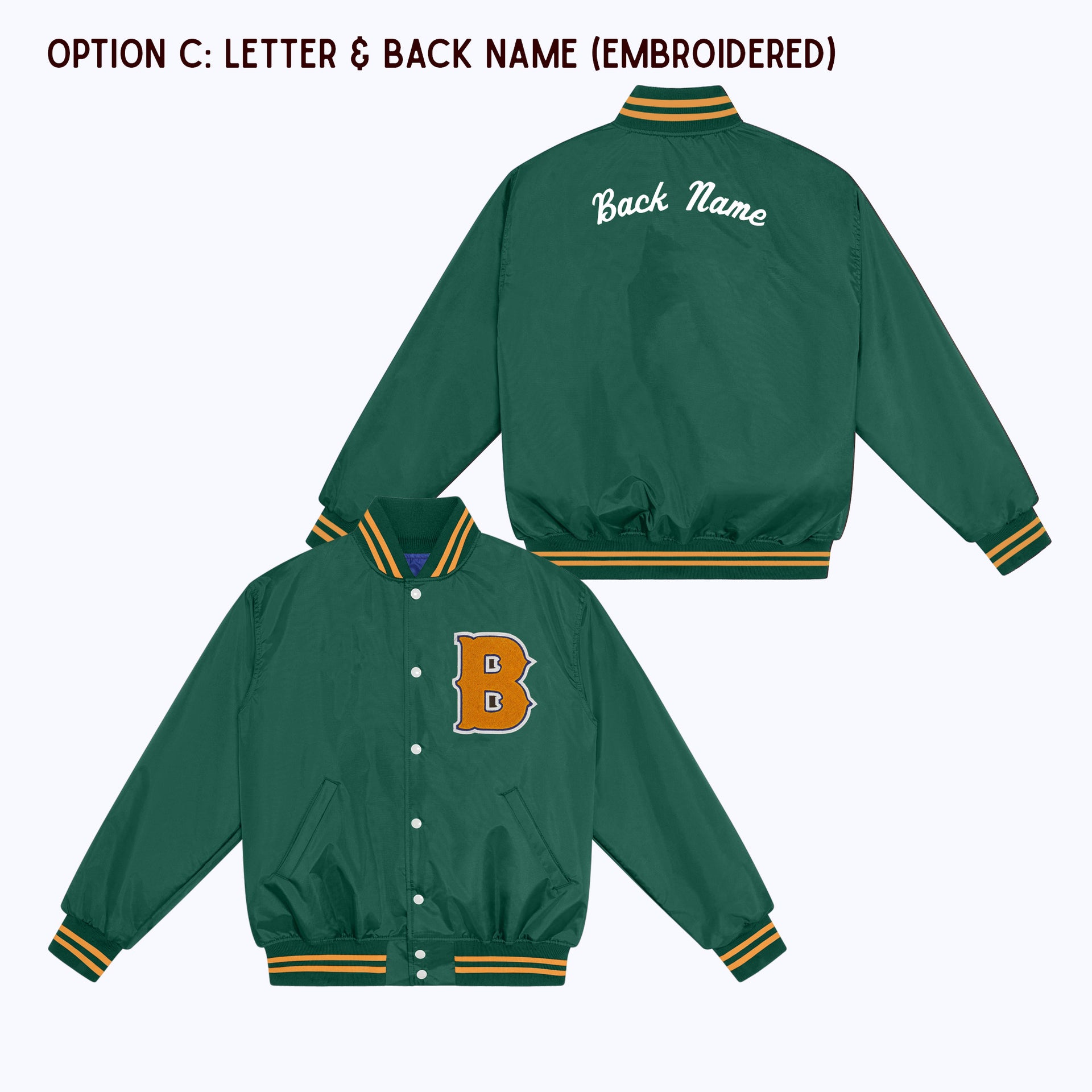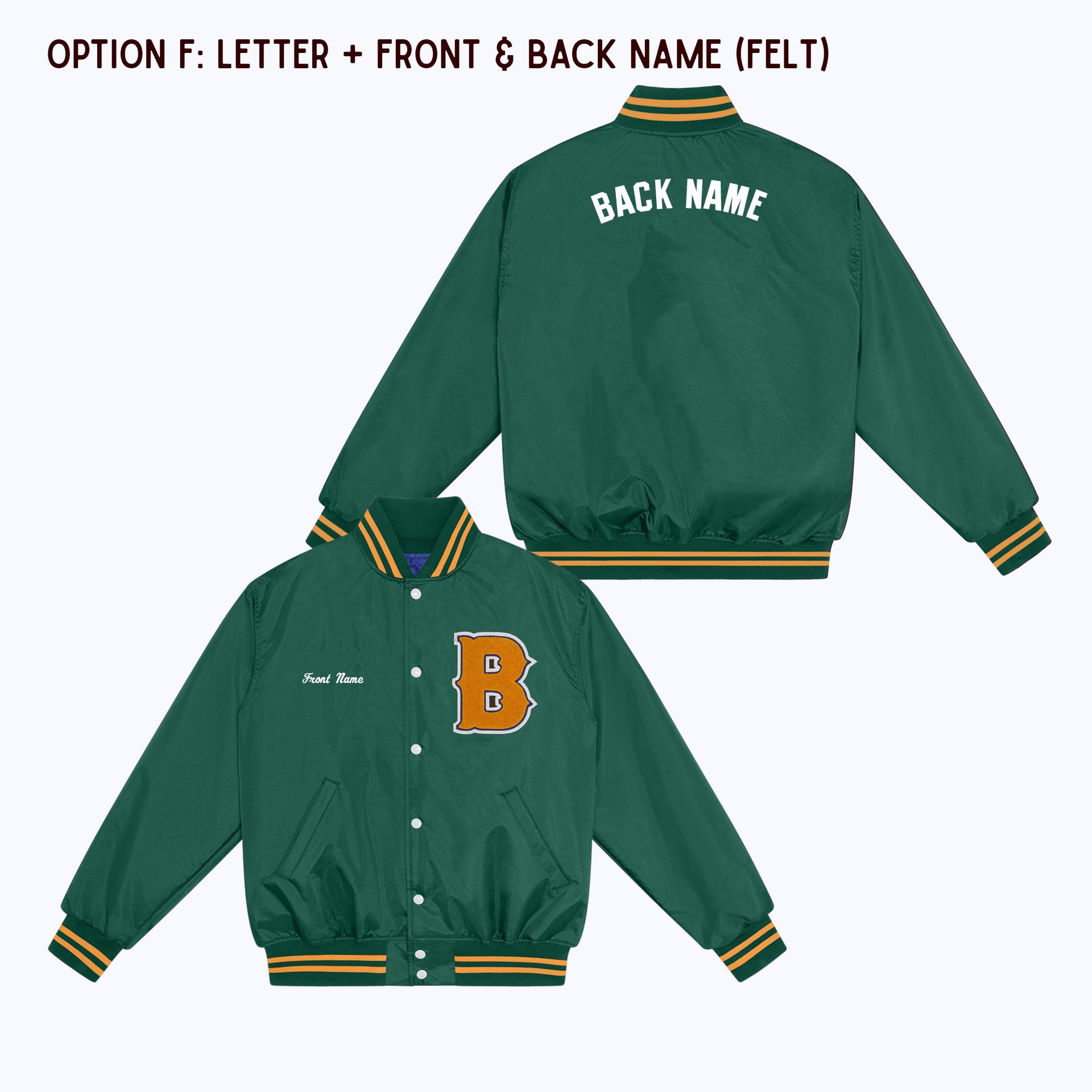 Personalized Custom Nylon Bomber Jacket with Chenille/Felt Letter Patch, and options to add embroidered and/or felt appliqué name(s)
