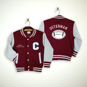 Soft cotton blend brushback sweatshirt fleece Baseball jacket with chenille & felt Varsity C letter patch and Football patch on the back.