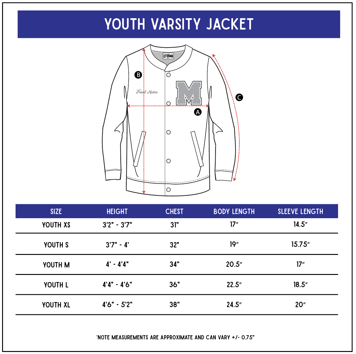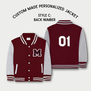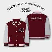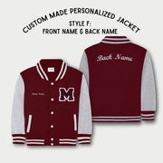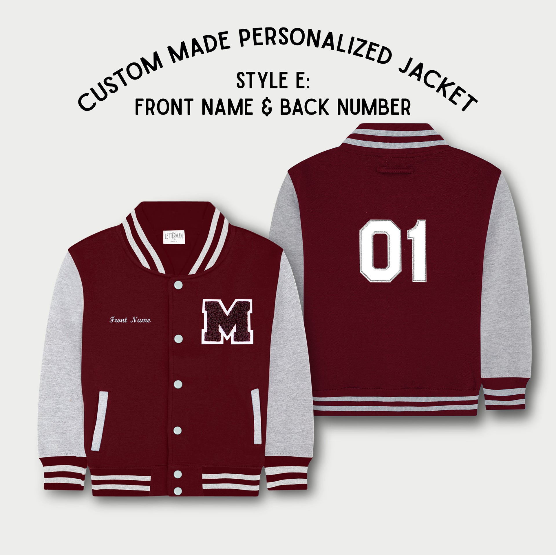 Personalized Sweatshirt Varsity Jacket. Made to order with varsity letter patch. Option to add; embroidered name(s) & appliqué number.*