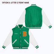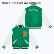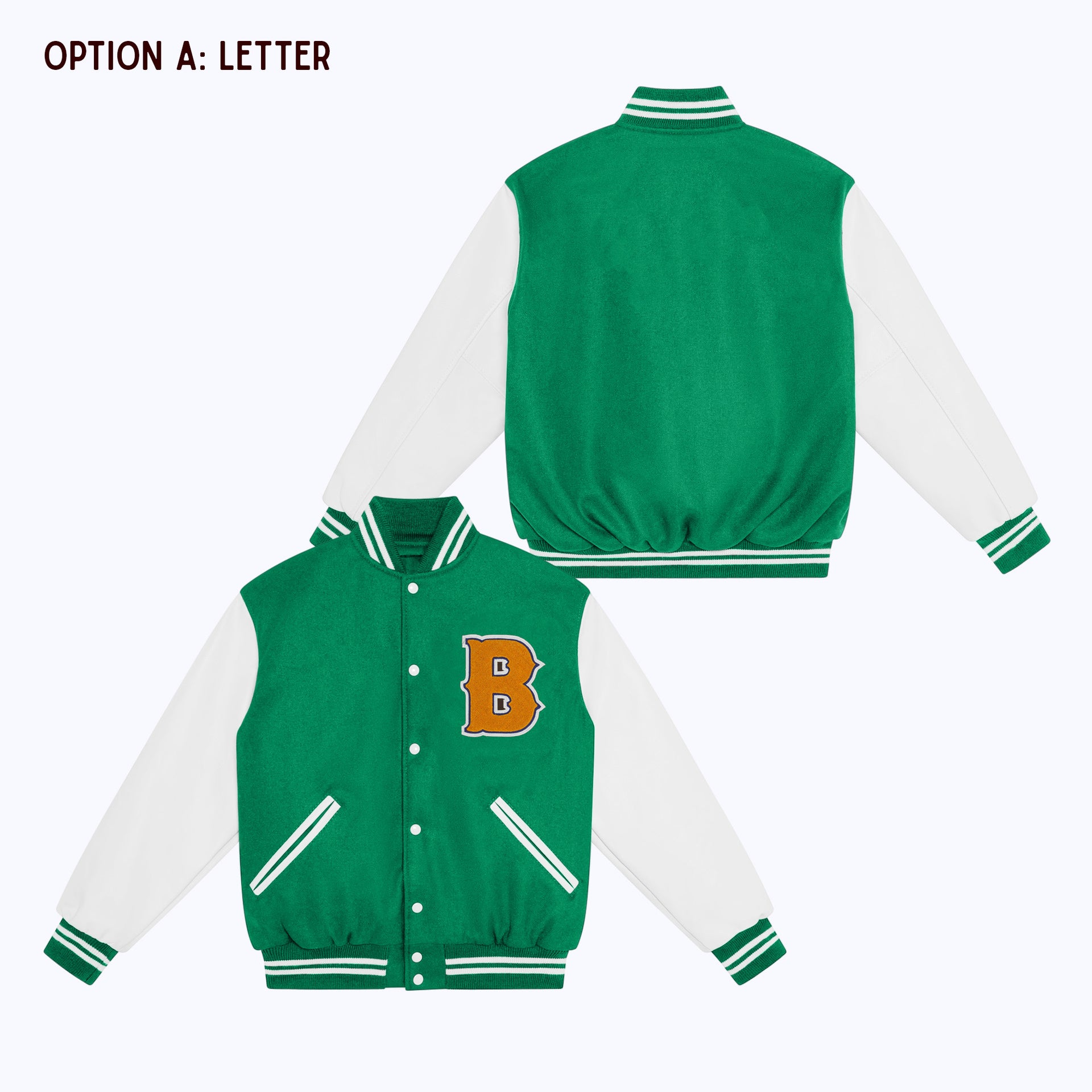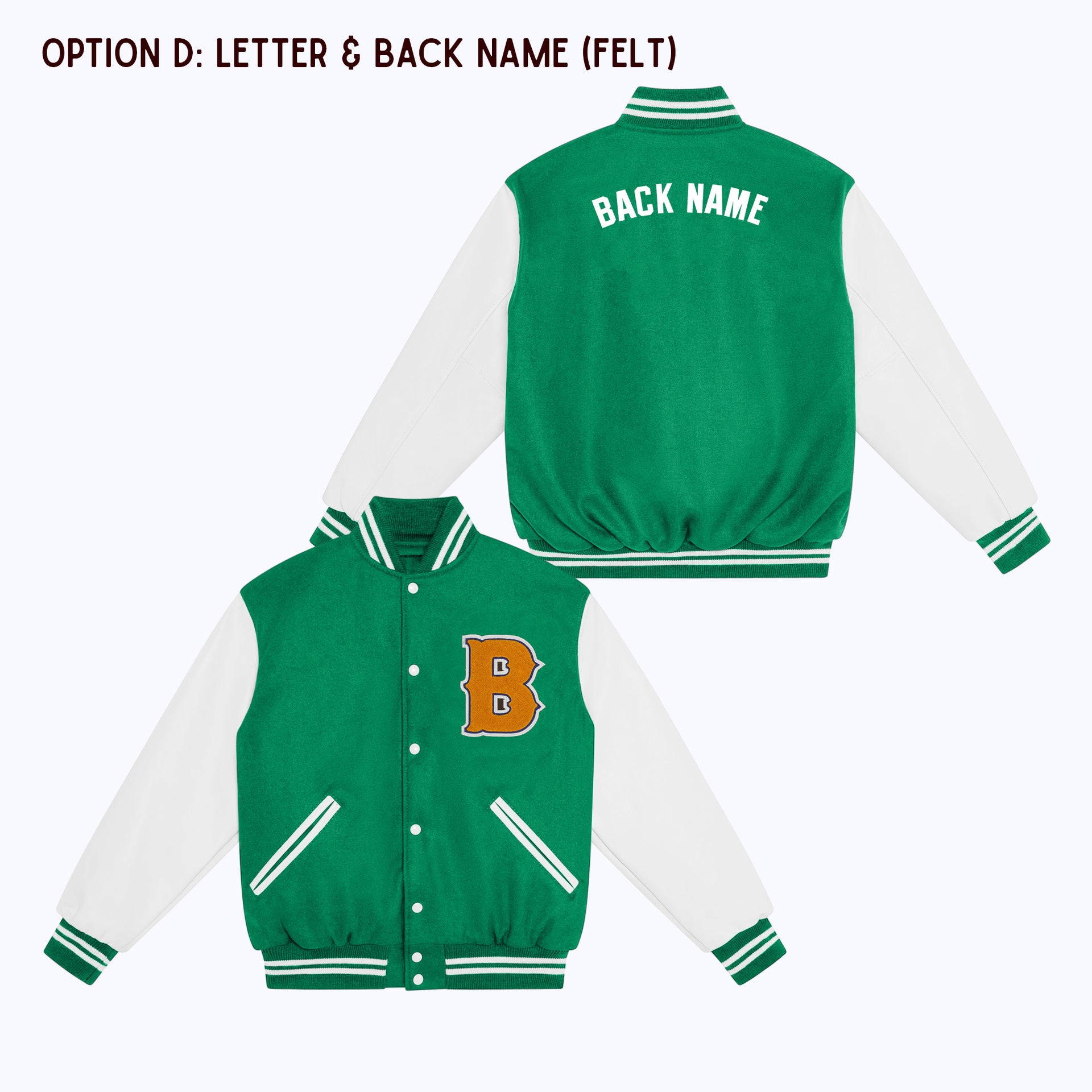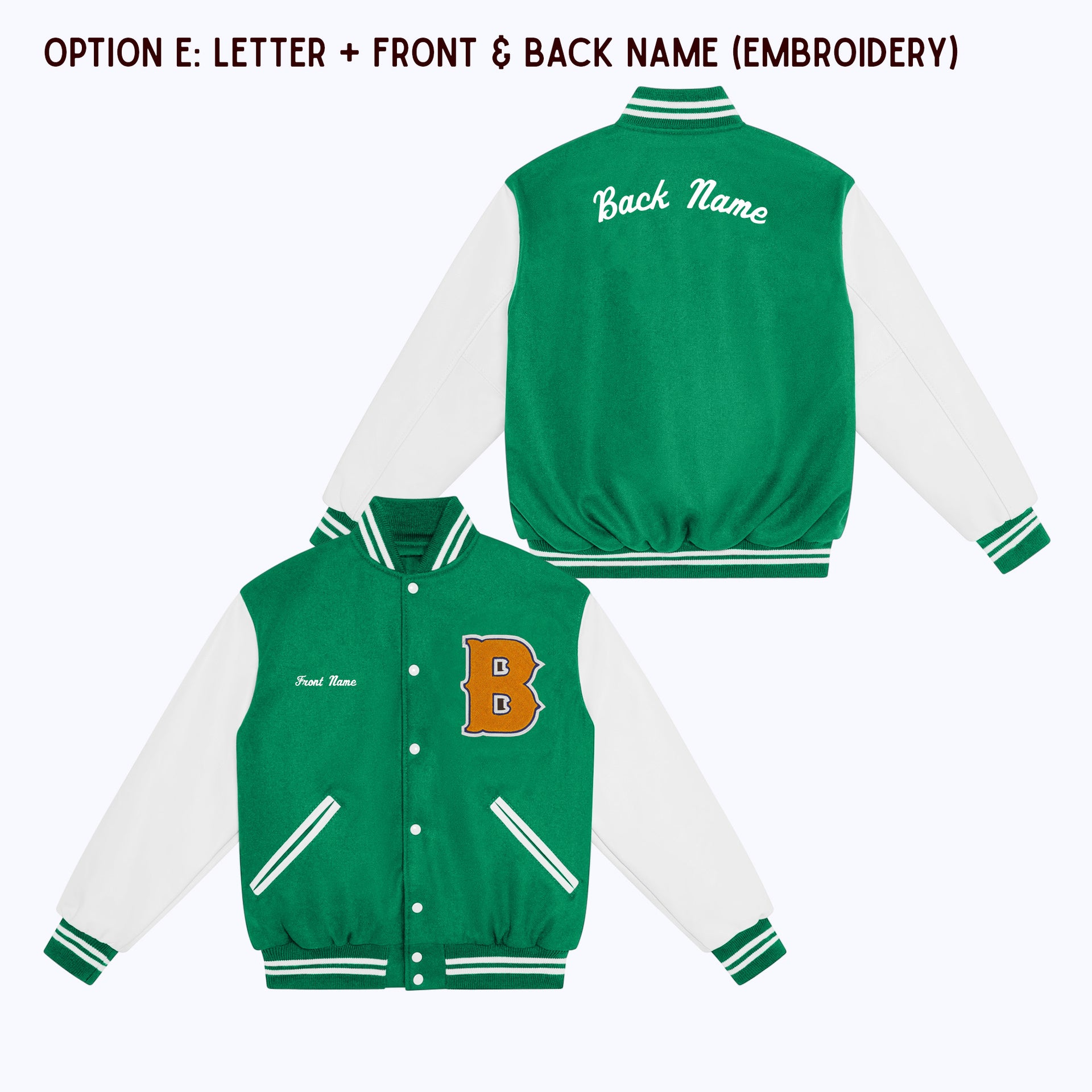 Personalized Custom Wool Varsity Jacket with Varsity Letter Patch, and options to add embroidered and/or felt appliqué name(s)