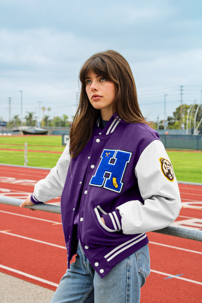 Personalized Adult Wool Leather Varsity Jacket PURPLE/WHITE