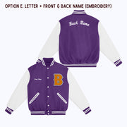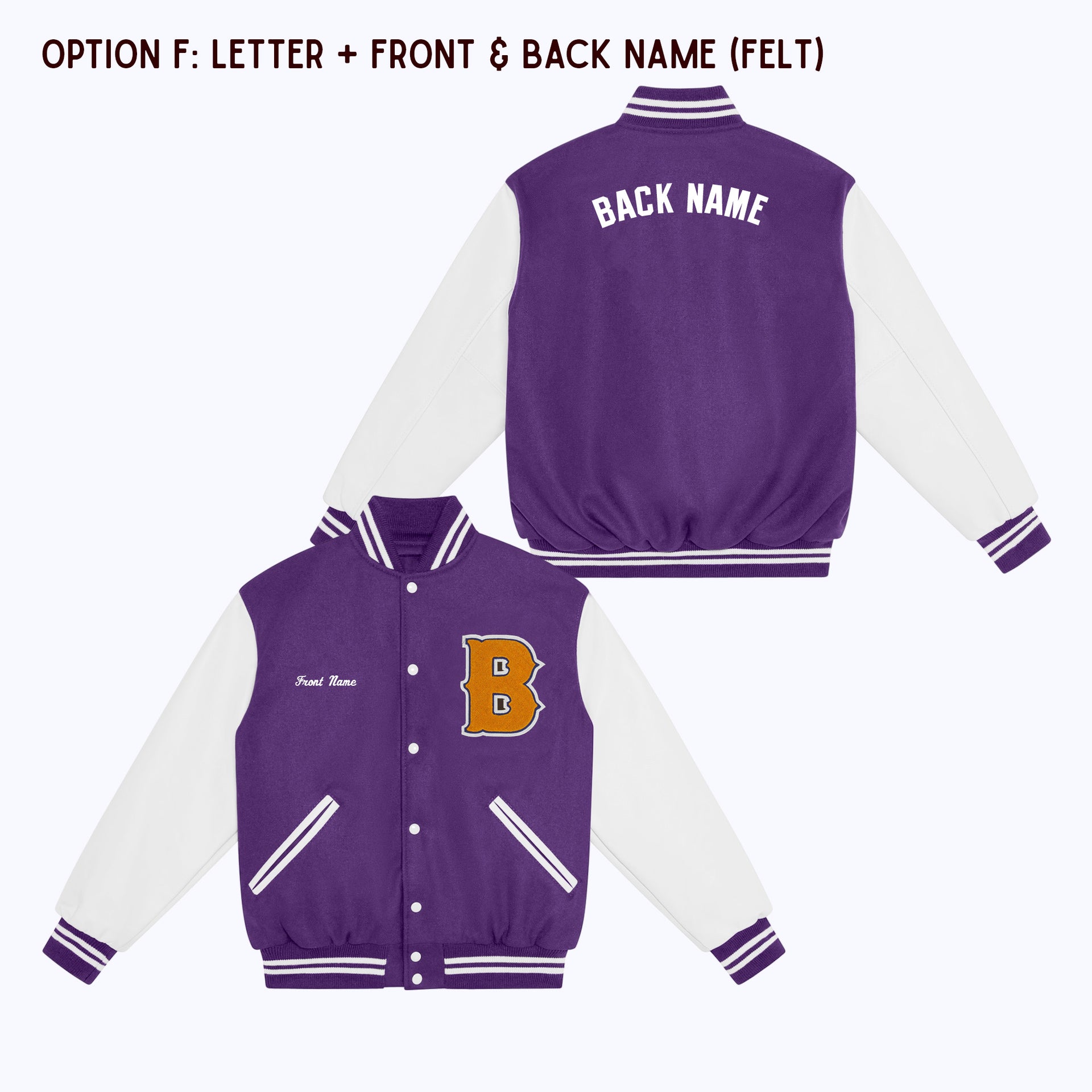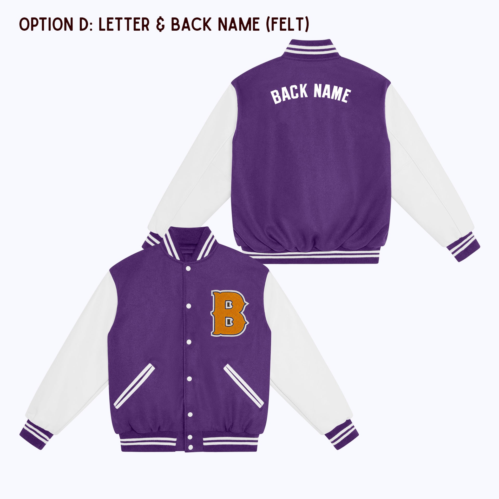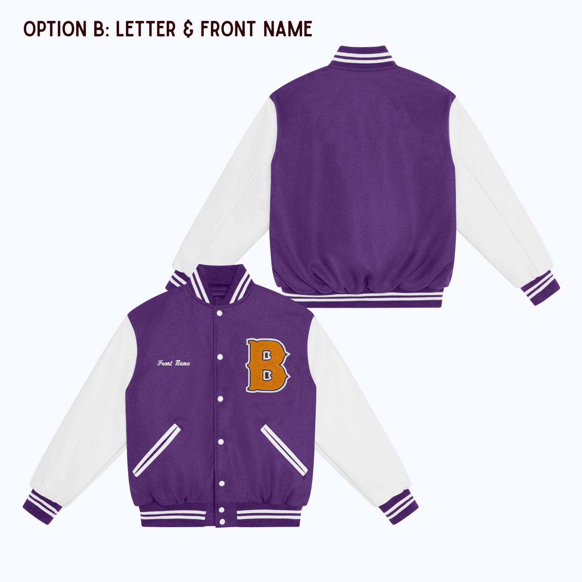 Personalized Custom Wool Varsity Jacket with Varsity Letter Patch, and options to add embroidered and/or felt appliqué name(s)